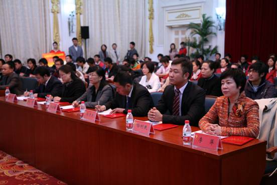 宁夏回族自治区党委副书记于革胜向宁夏青年创业就业基金会第一届理事会理事、监事颁发聘书(右五宁夏通达煤业集团总裁 李萍)